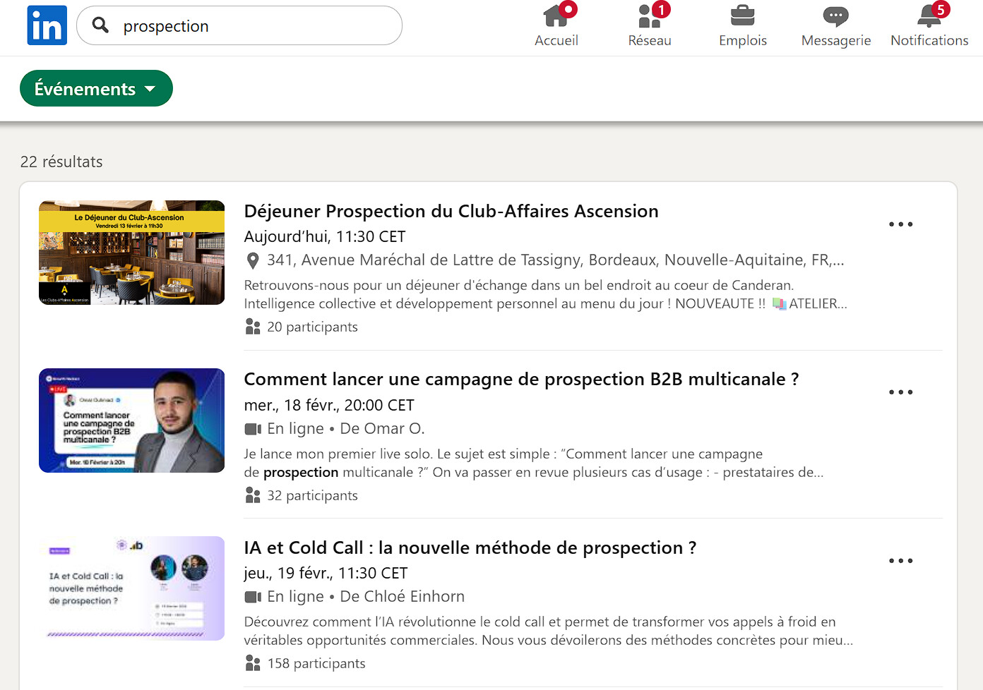 - Ensuite je filtre les résultats par « Evénements » pour obtenir la liste des rencontres physiques et webinaires sur un sujet précis (en l’occurence autour de la prospection).