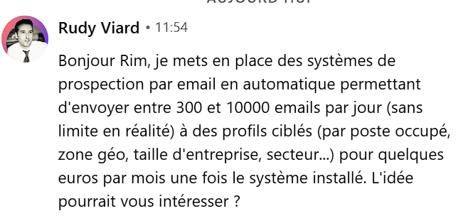 Bonjour {{firstName}}, je mets en place des systèmes de prospection par email en automatique permettant d’envoyer entre 300 et 10000 emails par jour (sans limite en réalité) à des profils ciblés (par poste occupé, zone géo, taille d’entreprise, secteur…) pour quelques euros par mois une fois le système installé. L’idée pourrait vous intéresser ?