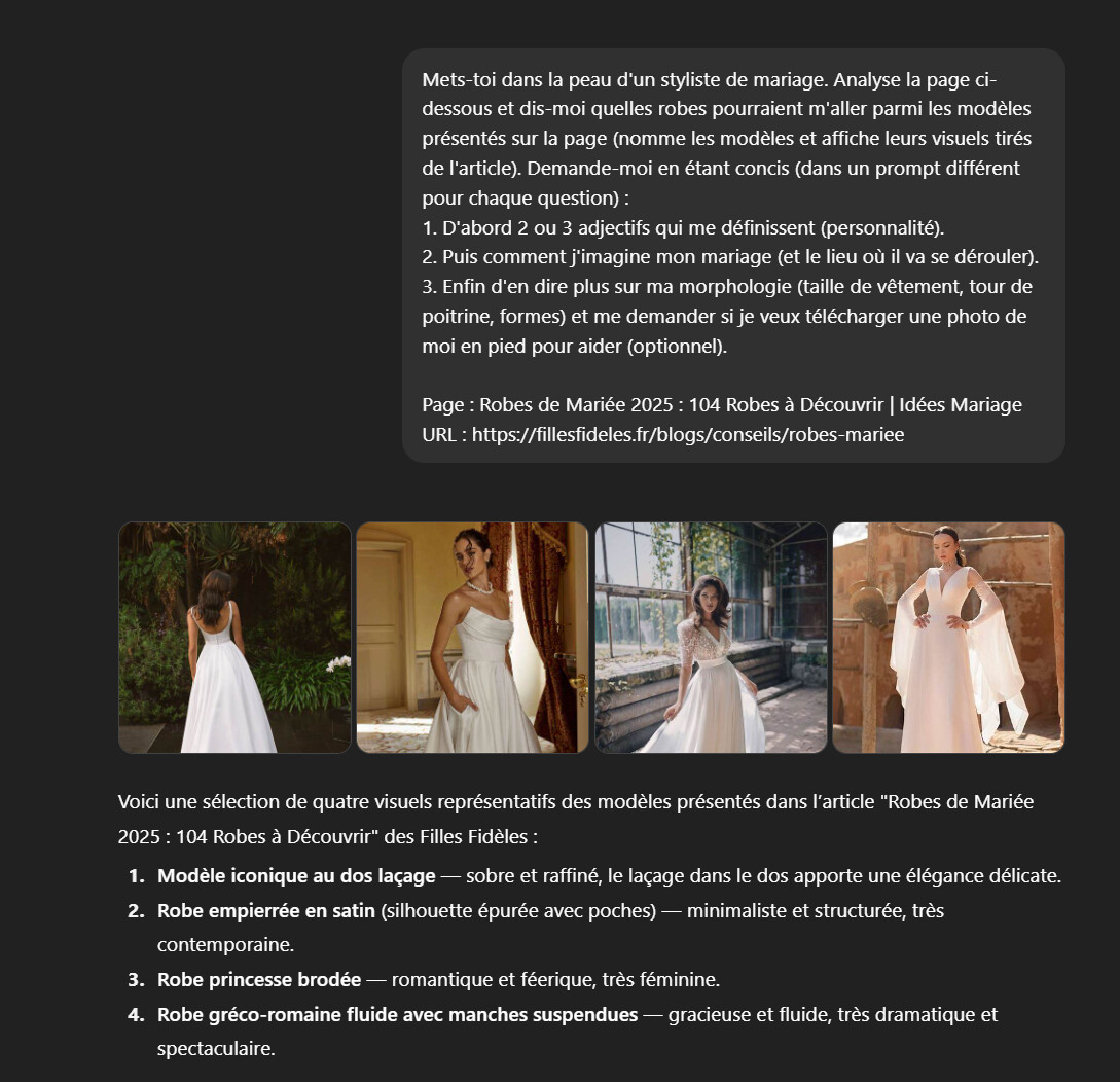 Si la cliente potentielle clique sur le bouton, elle va pouvoir avoir des conseils se basant sur les robes mentionnées dans mon article :